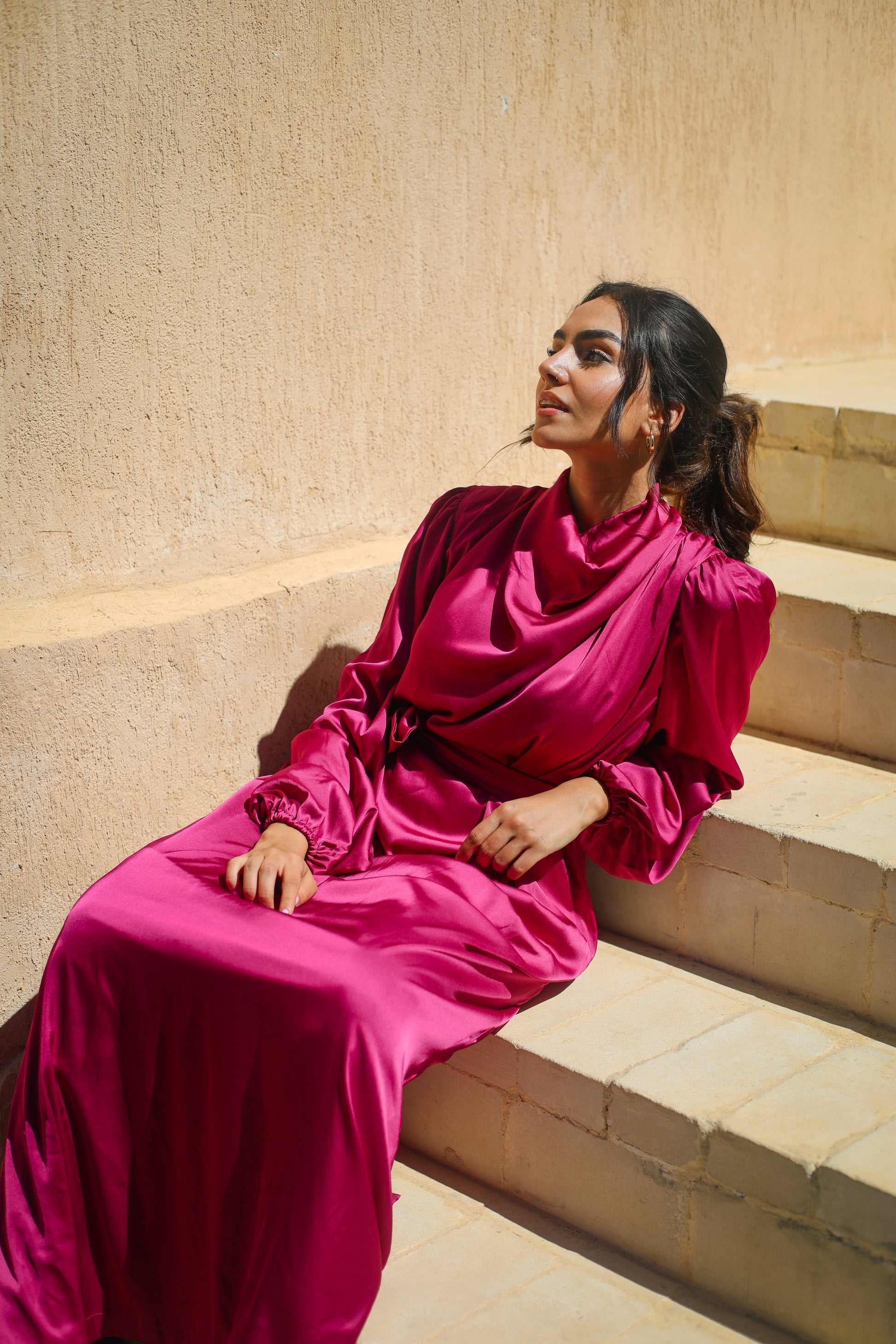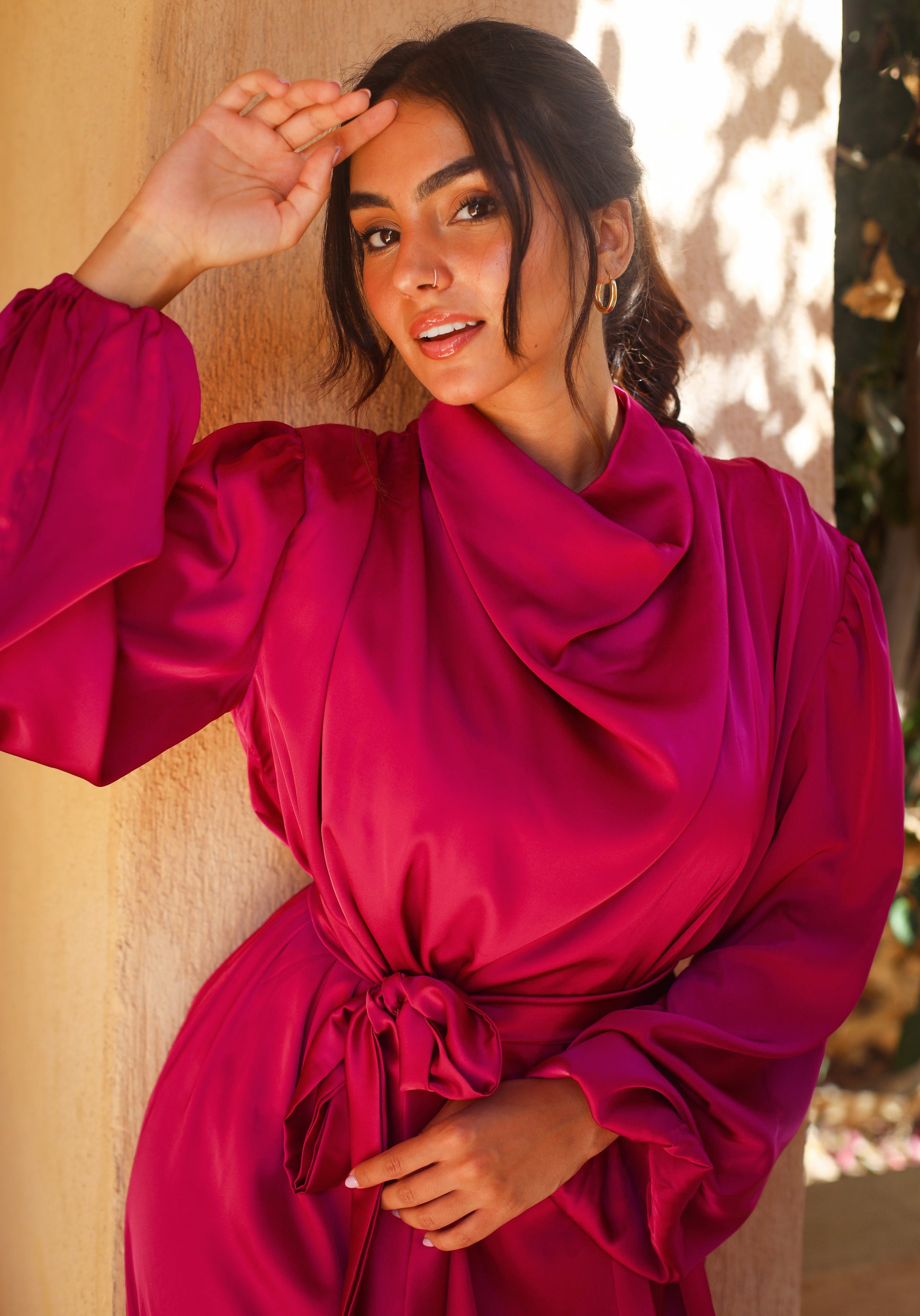 The modest silk dress that is perfect for the special occasions, comes with a wide belt to flatter the waist in a multiple ties.